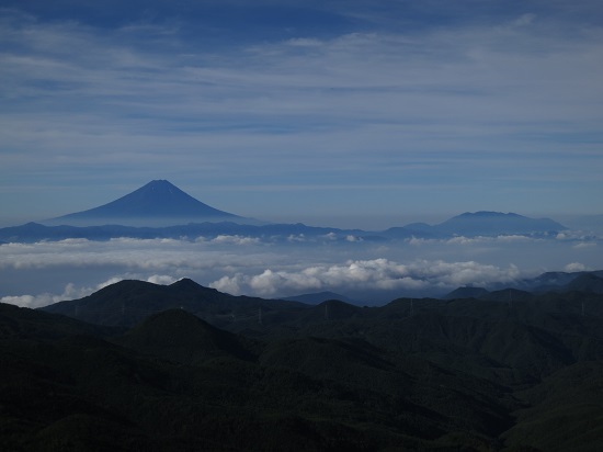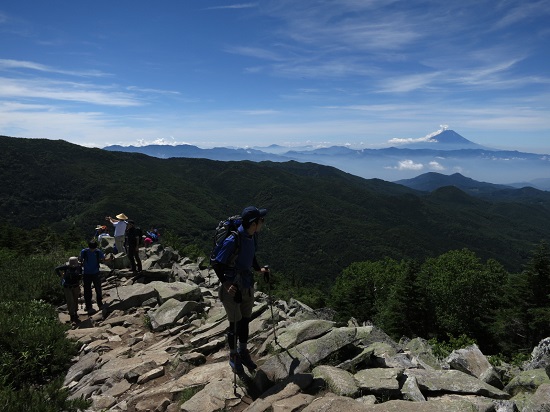 登山口から西の方へと山道を進んでいきます。稜線沿いなので基本的に展望はよく、木々が途切れると富士山などがよく見えます。