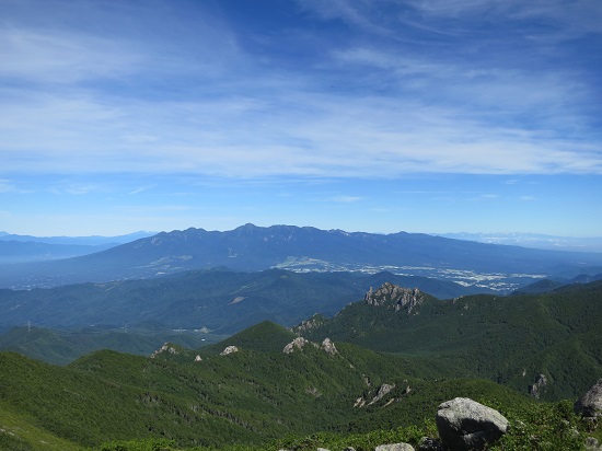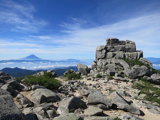 やがて360度の視界が開けた金峰山山頂にたどり着きます。富士山、南アルプス、八ヶ岳、天気がよければ北アルプスまで見渡せます。