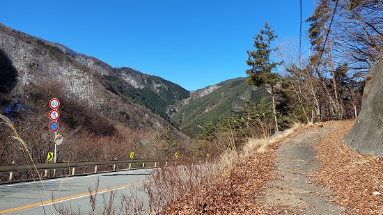 王岳川を渡った先、精進湖トンネルの手前辺りの山側に斜めに上っていく未舗装の林道があります。