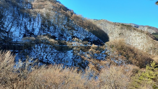 時期は2月下旬。数日前に降った雪が残っており、周囲の山肌は真っ白です。
