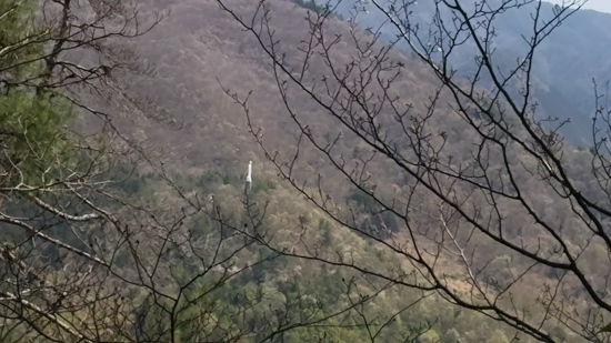 ちなみに登山道の中途から東側を見ると、木々の間から平和観音像が遠望できます。