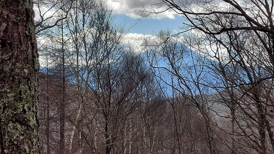 写真を何枚か撮って下山開始。南側の木々の間から富士山が見えました。