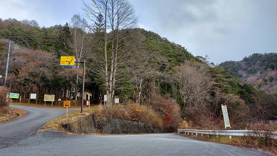 車で甲府市の荒川ダムを越えて野猿谷林道、御岳林道と上がっていき、黒平町の黒戸奈神社を過ぎた辺りの分岐を、荒川林道(乙女高原方面)へと進みます。