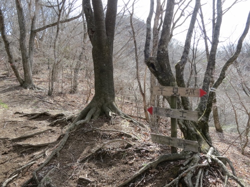 升形山を分岐点まで下り、さらに太刀岡山方面に大きく下り、また急斜面を登り返したところが鬼頬山です。