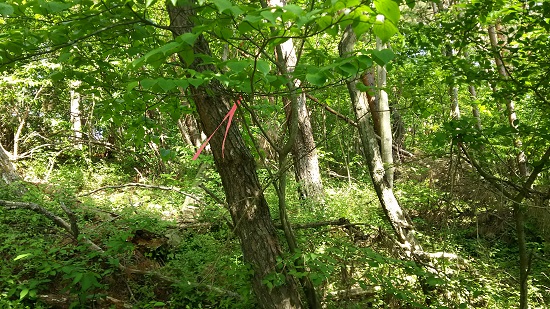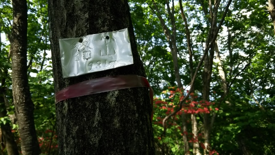 付近の待避所に車を停めて歩くと、山頂への取り付き部分にテープが貼られているのを見つけました。