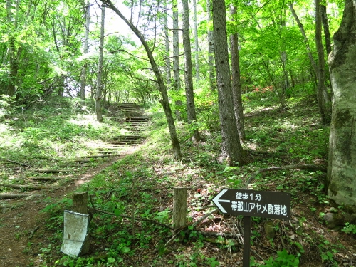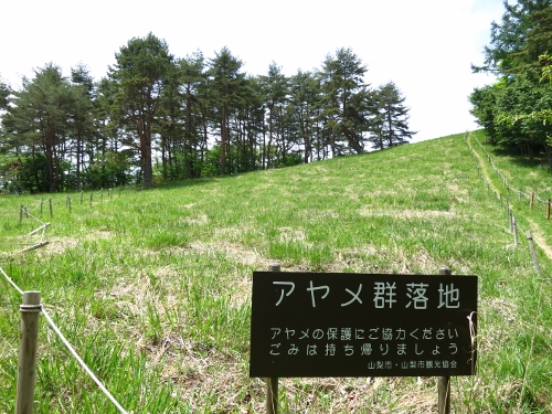 林道の途中にある駐車場に車を停めると、徒歩1分でアヤメ群落地と書かれた場所に着きます。