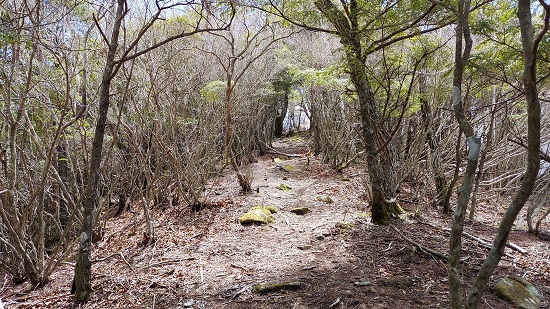 傾斜は結構きつく、息切れのする尾根道です。ストックを持ってきて良かったと思いました。