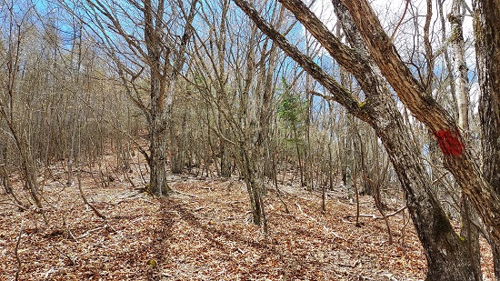時は5月。麓は新緑の季節を迎えていますが、この辺りはまだまだ枯れ野原。落ち葉を踏みしめながら、尾根沿いに上っていきます。