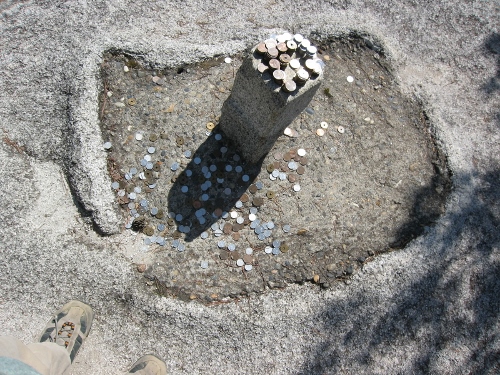 梯子のある岩場を登り、巨大な一枚岩でできた山頂へ。三角点が埋め込まれています。