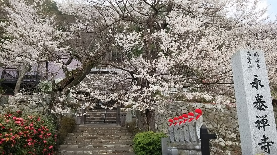 車で精進湖線を甲府から富士河口湖方面へと進み、上九の湯を過ぎた辺りで右折し、桜の咲き誇る永泰禅寺を横目に折八林道を登って行きます。