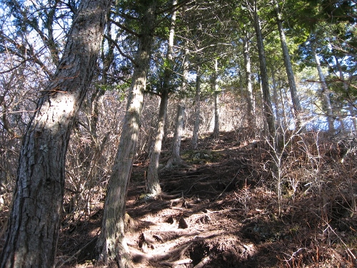 木立の中の巻き道を登っていくと30ほどで岩壁のあるエリアに着きます。