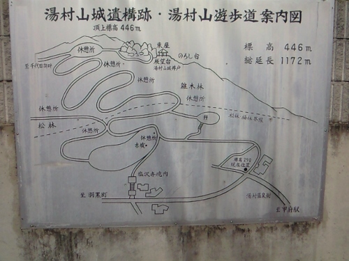 湯村山は戦国時代に山城があった場所であり、湯村温泉郷から遊歩道が続いています。