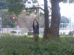 「地を這う前衛」田中泯さん。公式HPで新宿の路上で踊るという情報を得たので、行ってきました。時間と場所だけでが指定されていたので、近くのドトールでコーヒーを飲みながら出現を待つ。なかなか始まらないなと思っていると、やがて外に集まった人々が何やら見上げている気配を感じました。店を出てみると、なんと泯さんは近くの雑居ビルの3、4階の窓から出現。そこから身を乗り出すようにして踊っているのが見えました。落ちるんじゃないかとはらはらしながら見ていたのですが、やがて一度、中に引っ込みました。しばらく間をおいて、今度は一回から路上に出現。宝くじ店の看板にぶら下がったり、近くの植え込みの潜り込んだりとやりたい放題。やがて、宝くじ店のおばさんが通報したのか、集まりすぎた観客が車道にはみ出して危なかったからなのかわかりませんが、パトカーと警官が出動する騒ぎに。